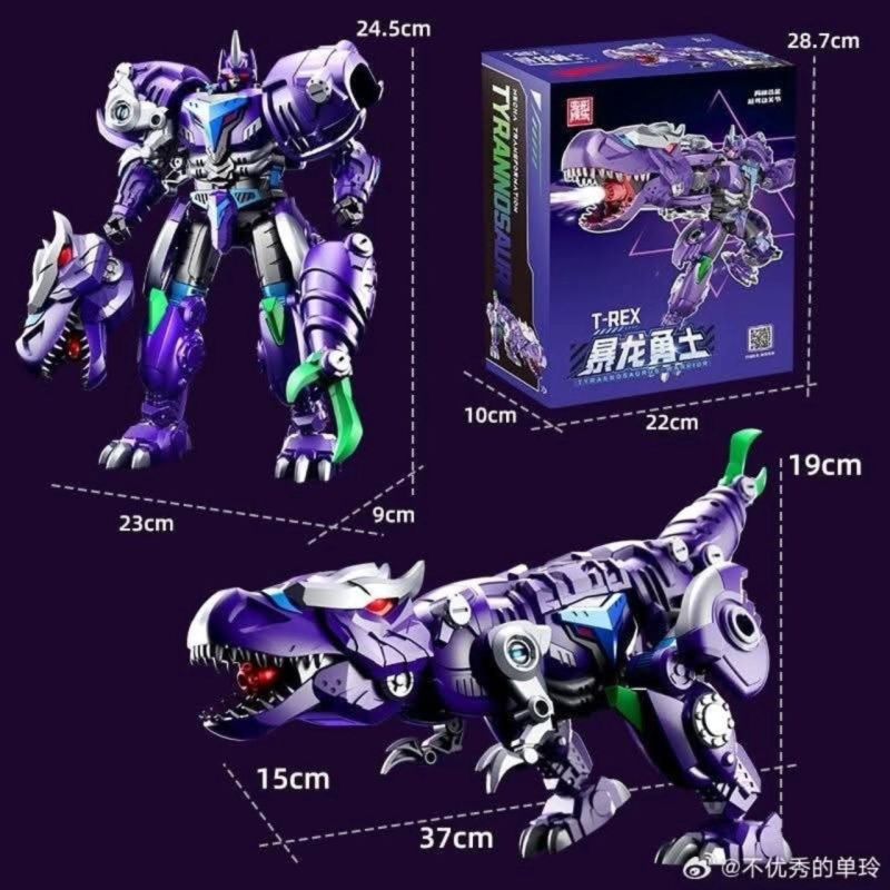 Produk ini adalah figur aksi "Lijiang Megatron," sebuah robot berbentuk dinosaurus dengan dominasi warna ungu metalik dan aksen biru serta hijau. Didesain dengan detail tinggi, mainan ini menampilkan kepala T-Rex sebagai bagian dari lengan kanan, serta armor yang kokoh dan mekanisme sendi yang fleksibel untuk berbagai pose dinamis. Lijiang Megatron sangat cocok untuk kolektor maupun penggemar robot transformasi yang menginginkan tampilan garang sekaligus unik pada koleksi mereka. Setiap detail pada figur ini memberikan nuansa futuristik serta kemewahan, menjadikannya centerpiece yang menonjol di setiap rak display.